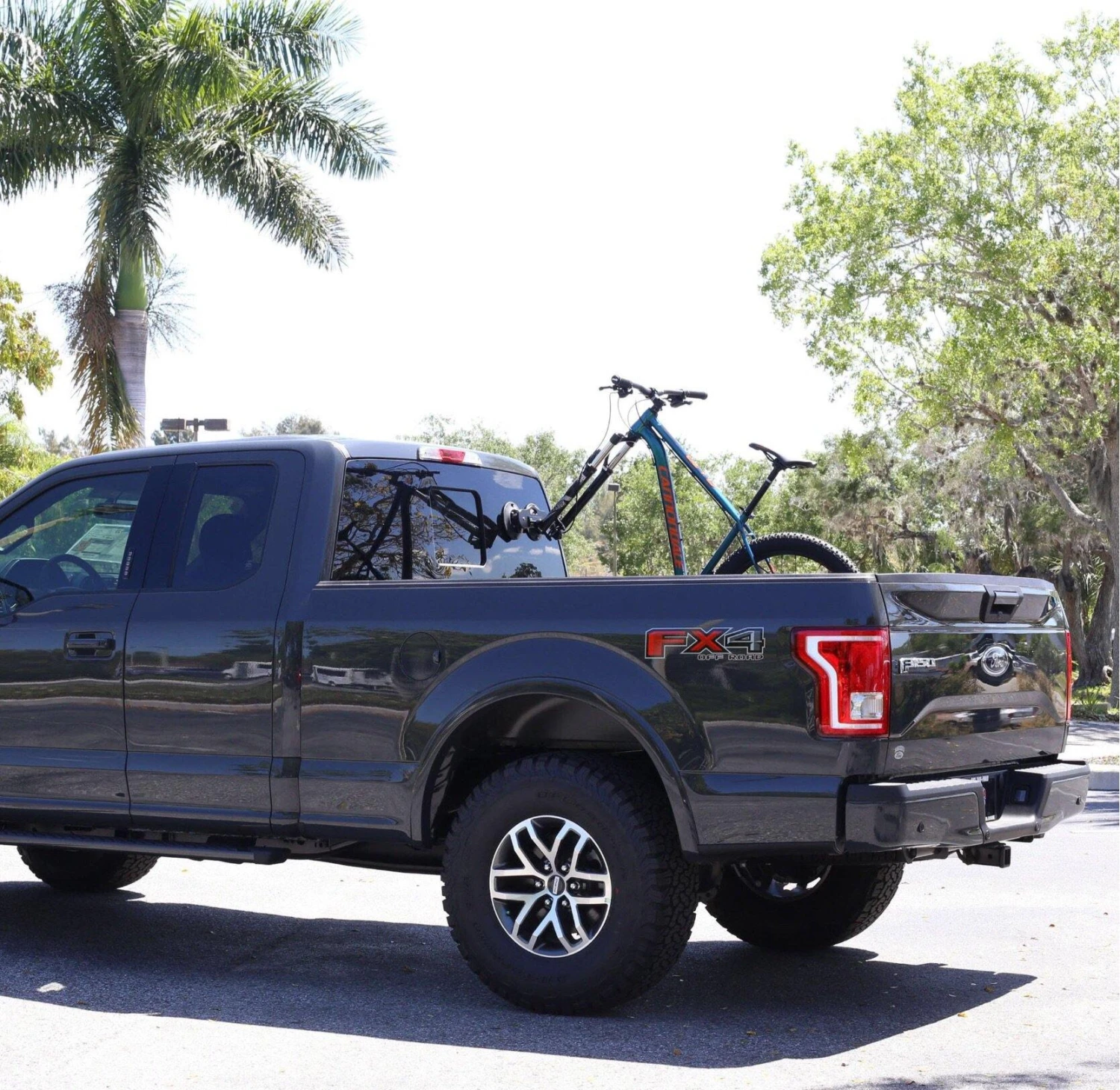 2019 Model Falcon with Universal Fork Mount upgrades with 9mm plugs and skewer. The Falcon is our pickup-truck-specific 1-bike carrier. It’s a fork-mount-style rack, with two of our powerful (210lb pull-strength rated) vacuum cups holding it onto the back window of your pickup. Incredibly easy to install, and removes in just seconds, all without marking your car.