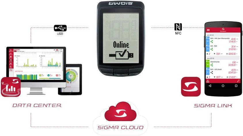- Simple data handling. Data transmission is fast and convenient. With the SIGMA LINK app and an NFC-compatible Android smartphone, settings and trip data can be transmitted wirelessly and read out in the app. Alternatively, you can connect the bike computer directly to your terminal device with a micro-USB cable. Use the DATA CENTER for an even more detailed view and analysis of the completed tracks.